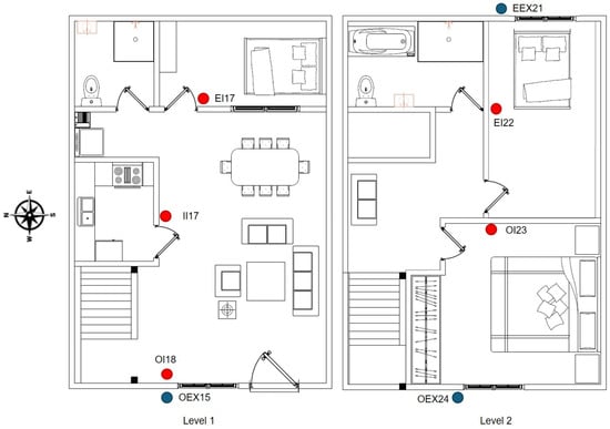- Indoor sensors: Five sensors were positioned within the building. One was on the ground floor, one sensor was placed in an east-facing room to record morning thermal gains, one was in a west-facing room to monitor afternoon heat effects, and another was in a centrally located room to establish baseline conditions. On the upper floor, one sensor was located in an east-facing bedroom and another in a west-facing bedroom to capture vertical stratification and room-specific dynamics.
