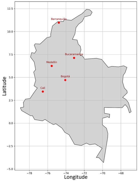 - IDEAM. Instituto de Hidrología, Meteorología y Asuntos Ambientales Catalogo Estaciones IDEAM. Available online: https://www.datos.gov.co/Ambiente-y-Desarrollo-Sostenible/Cat-logo-Nacional-de-Estaciones-del-IDEAM/hp9r-jxuu/about_data (accessed on 21 January 2025).