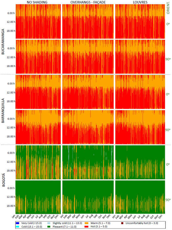 - Finally, the model is used to design and evaluate a set of different strategies with the aim of evaluating their impact, considering both the cooling demand and indoor comfort, not only assuming different orientations and locations (representative of the different Colombian climates) but also considering one of the future climate scenarios projected by the IPCC. Thus, 960 different combinations were simulated under two different approaches (resulting, then, in 1920 simulations), and the obtained results were carefully analysed. Additionally, these results are publicly available in a data set stored in Mendeley Data Repository [16].