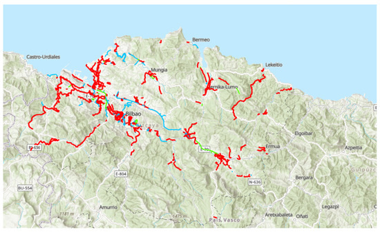 Bizkaia’s cycling network (green: under construction; red: executed; blue: planned). Source: https://geo.bizkaia.eus/ (accessed on 4 December 2024).
