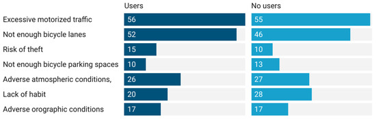 According to data from the first Bizkaia bicycle barometer [43], 50% of Bizkaia citizens have their own bicycle and 38% are regular or occasional users of this mode of transport. The use of bicycles is linked, above all, to sports (49%) and health (44%) and, to a lesser extent, to mobility (36%) and the environment (31%). Six percent stated that they use this means of transport to go to work or to school. The average number of bicycles in Bizkaia households is 2.6, with mountain bikes (70%) being the most common. Electric bicycles are gaining ground, although only 6% of Bizkaia citizens say they own an electric bicycle. A total of 52% of regular users consider that their municipality is friendly/safe for cycling, with large differences in this perception also standing out by county. Among those who do not consider their municipality friendly/safe for cycling, the following reasons stand out: the lack of cycle paths or their poor design (73%), excessive traffic (51%), a municipality that is not adapted (41%), or the orography (37%), among others. Among the main difficulties for cycling in the city, 73% of the population has mentioned excessive motorized traffic, insufficient bicycle lanes, the risk of theft, and the insufficient number of bicycle parking spaces (Figure 2).