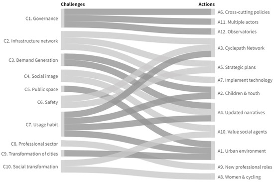The figure below (Figure 3) illustrates the different challenges and their connections with the strategic actions to be implemented to advance toward sustainable urban mobility through cycling in Bizkaia.