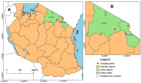 The study was conducted in the Arusha and Kilimanjaro administration regions, two of the five regions located in northern Tanzania, as shown in Figure 1. Figure 1A provides a broader view of Tanzania, highlighting the selected study regions, while Figure 1B offers a more detailed view of the sampling points within Arusha and Kilimanjaro. Arusha (3.3869° S, 36.6829° E) covers an area of approximately 37,576 km2 and consists of seven districts, with an estimated population of 1.7 million people [39,40]. The region experiences average daily temperatures of between 18 °C and 22 °C, with rainfall ranging from 1800 mm annually on Mount Meru to 508 mm in the semi-arid plains [40]. The elevation of Arusha ranges from 900 to 1600 m above sea level. The region’s key economic activities revolve around agriculture, particularly the cultivation of coffee, as well as various vegetables, such as cabbages, broccoli, spinach, and amaranth [40,41,42]. In addition to agriculture, the region engages in mineral extraction, mining resources such as magnesite and meerschaum, as well as deposits of salt, mica, saltpeter, and ochre [40].