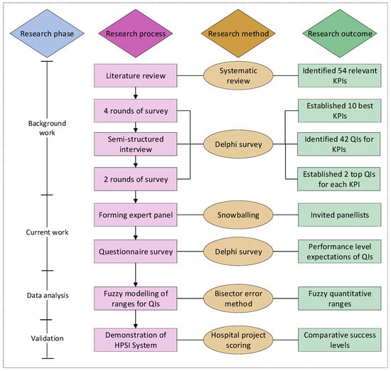 Due to the nature of the study, a quantitative methodology comprising a questionnaire survey and fuzzy set theory was utilized to achieve the objectives. The questionnaire survey was issued to solicit the opinions of experts regarding the performance expectations for different performance grades of the KPIs and quantitative indicators (QIs) of HP success. In addition, the fuzzy set theory was engaged to define appropriate ranges for the different performance grades. The research framework designed for the study is illustrated in Figure 1.
