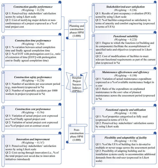 Construction literature is filled with several collections of performance criteria for predicting the success of diverse types of construction projects. The construction HP scope has risen to prominence around performance measurement because these projects are the mighty pillars underlying any working healthcare system globally. A thorough search of pertinent literature has revealed the proliferation of time, quality and cost performance as vital criteria for evaluating success in the planning and construction phases of HPs. These three criteria serve as the most basic and common system for evaluating the performance of construction projects historically. Their relevance is key in this study because HPs are of unique characteristics (e.g., complexity), for handling emergency healthcare situations, and for sustaining lives [5,8,11,19,20,27,28,29,30,31]. Accidents, injuries and casualties fraught the execution of construction HPs. Because the rights and values of human resources are to be protected, several safety mechanisms and systems are implemented by regulation or responsibility to curb the spate of safety issues on HP sites. Thus, safety performance is hugely acknowledged to be an important criterion for determining the success of HP execution [5,31,32,33,34]. In addition, the planning and construction of HPs is taking a more scientific approach to achieving better outcomes through the innovation of inputs (e.g., processes, techniques, resources, technologies, etc.). Measurable improvement is guaranteed when construction organizations implement original or adopted innovative ideas in HPs, and thus serve as a good yardstick for evaluating success [5,33,34,35].