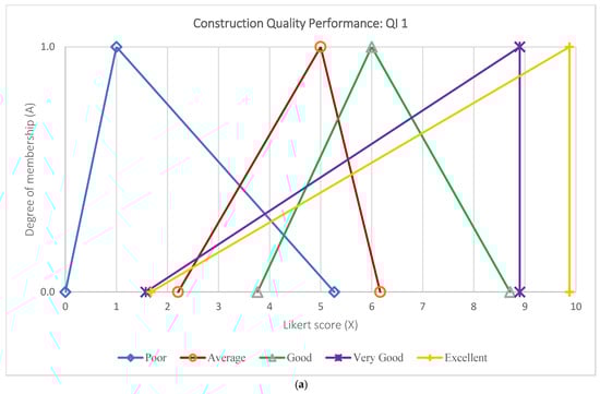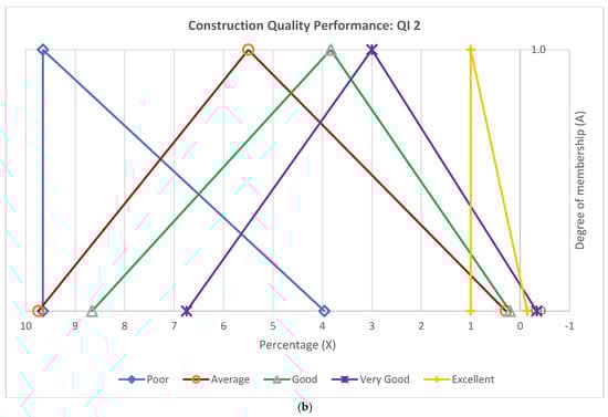 Table 7 and Table 8 show the fuzzy QRs of KPIs at the planning and construction phases as well as the post-construction phase of HPs. The underlying fuzzy membership functions of the QIs of construction quality performance are indicated in Figure 3a,b for illustration. The intersection points of successive fuzzy membership functions are used to determine the QRs of QIs, representing the five unique performance levels, namely poor, average, good, very good and excellent. Detailed information on the fuzzy QRs of the QIs for individual KPIs determined by the VEM, HEM and BEM against the five performance levels is used to generate Table 7 and Table 8. It can be concluded that the VEM, HEM and BEM produce quite similar results as the deviations are not too much.
