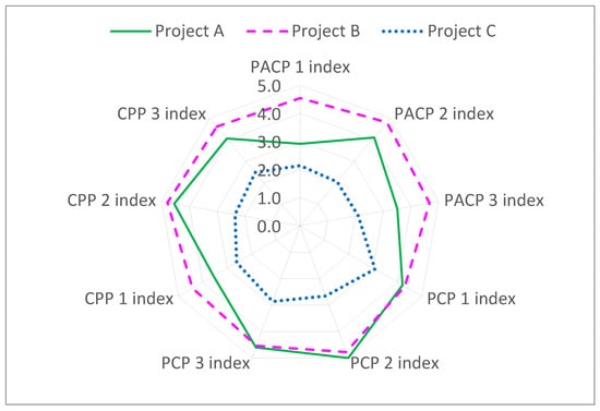 Generally, the comparative success levels are in the descending order of Project B, Project A and Project C during the planning and construction phases. Considering the post-construction phase, the top-down order of success levels is Project A, Project B and Project C. The combined project phases manifest Project B as the most successful, followed by Project A and then Project C. These comparative results of the alternative success indexes across the life cycle phases of HPs are further visualized with a spider diagram (see Figure 4).