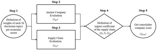 Ref. [19] discussed the ESG ratings based on the EU Taxonomy using related firm data in tobit regressions. It was stated that a logic of obtaining an ESG rating could be used to achieve the needed scores. Ref. [20] proposed an indicator grid that specifically monitors and measures the sustainable impacts of the manufacturing companies’ operations, allowing them to rank and compare their performances; they made a systematic review of the literature and professional standards to define the material aspects to be evaluated. Moreover, ref. [21] employed a random forest algorithm to investigate how structural data affect the ESG scores for companies. As a result, they found that the balance sheet is a crucial element to the ESG scores. These strategies and methods are examples of how to obtain the score for each topic that is needed to apply the developed formulas to obtain the final ESG scores for the companies and SC. Participating companies must complete this step before using the model and potentially create a database with this information to facilitate further steps.