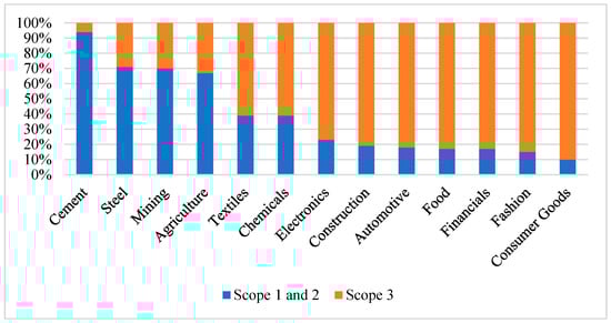 Emission split in scopes 1, 2, and 3 for selected industries (CO2e, 2019). Source: adapted from [24].