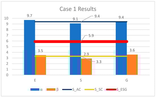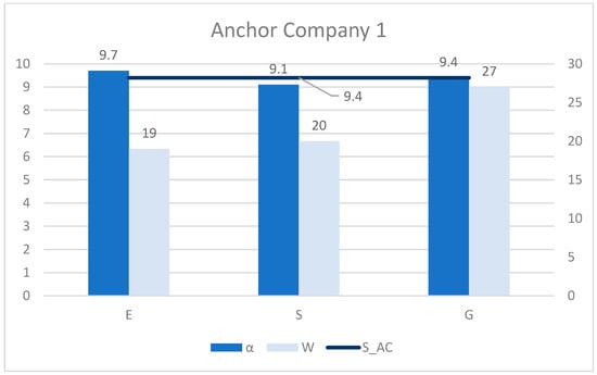 After inputting the data in Table 5 into the model, the result of the AC 1 ESG evaluation is presented in Figure 3, divided into three groups: E for environmental, S for social, and G for governance. The blue bar (α) represents the score for each aspect of the E, S, or G, showing that The light blue bar represents the weight of each aspect, where WE = 19, WS = 20, and WG = 27. Finally, the dark blue line shows the final ESG score of AC 1 that comes from the interaction with all the elements, where = 9.4.