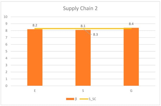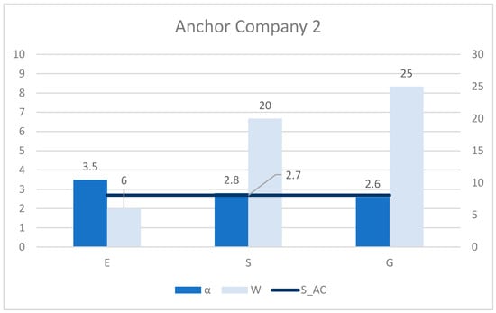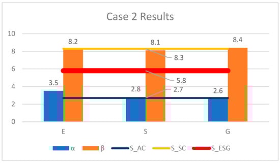 Figure 11 shows the consolidated ESG score for the relationship between AC 2 and SC 2, divided into three categories: environmental, social, and governance. Blue bars (α) represent the AC 2 score for each category ( = 3.5; = 2.8; = 2.6), while orange bars (β) represent the SC 2 score for each category ( = 8.2; = 8.1; = 8.4). The dark blue line represents the final ESG score of AC 2 ( = 2.7), and the yellow line represents the final ESG score of SC 2 ( = 8.3). The red line shows the consolidated ESG score of the AC, considering the SC ( = 5.8) based on the interaction of these scores and considering the impact coefficient data of Figure 10.