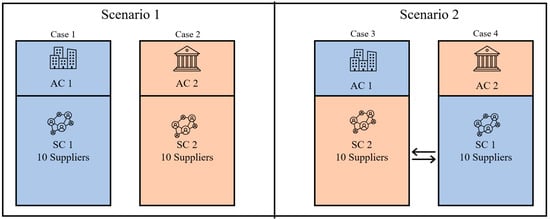 Two different scenarios are analyzed by changing the owner of the SC. As illustrate in Figure 7, the first scenario analyzed AC 1 with SC 1 and AC 2 with SC 2, and the second scenario analyzed AC 1 with SC 2 and AC 2 with SC 1. The colors facilitate the visualization and the understanding of the proposal. Moreover, even though the ACs are the same in both scenarios, the objective of switching the SC sample is to test the interaction and the different impacts from different ESG maturity levels in the same company.