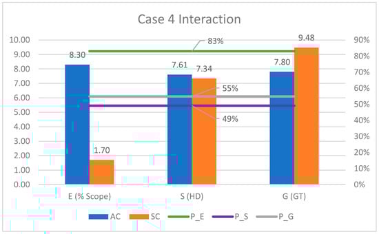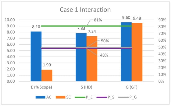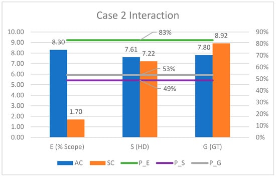Case one represents the interaction of AC 1 and SC 1. First, it is required to calculate the impact coefficient of the SC in the AC, and it is going to have a different value for each area: environment, social, and governance. The input of data from AC 1 and SC 1 on the model generates result illustrated in Figure 8 that is divided into three groups, showing the impact coefficient for environmental (% scope emissions based on Figure 2), social (HD), and governance (GT). The blue bars represent the data from the AC for each topic (% scope 3 = 8.10; = 7.83; = 9.60), and the orange bars represent the data from each topic (% scope 1+2 = 1.90; = 7.34; = 9.48). Based on this interaction, the impact coefficient is represented on the lines: the green line represents the environmental ( = 81%), the purple line represents the social ( = 48%), and the gray line represents the governance ( = 50%).