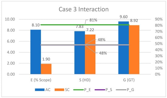Case three treats the interaction of AC 1 and SC 2. Figure 12 shows the results of the analysis, divided into the ESG three groups. The blue bars represent the data from the AC for each topic (% scope 3 = 8.10; = 7.83; = 9.60), and the orange bars represent the data from each topic (% scope 1 + 2 = 1.90; = 7.83; = 8.92). Based on this interaction, the impact coefficient is represented on the lines: the green line represents the environmental ( = 81%), the purple line represents the social ( = 48%), and the gray line represents the governance ( = 48%).