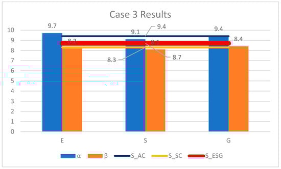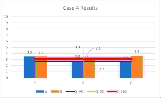 Case four represents the interaction of AC 2 and SC 1, and Figure 14 presents the results of this analysis considering the ESG groups. The blue bars represent the data from the AC for each topic (% scope 3 = 8.30; = 7.61; = 7.80), and the orange bars represent the data from each topic (% scope 1 + 2 = 1.70; = 7.34; = 9.48). Based on that interaction, the impact coefficient is represented on the lines: the green line represents the environmental ( = 83%), the purple line represents the social ( = 49%), and the gray line represents the governance ( = 55%). Figure 15 shows the consolidated ESG score where blue bars (α) represent the AC 2 score for each category ( = 3.5; = 2.8; = 2.6) and orange bars (β) represent the SC 1 score for each category ( = 3.5; = 2.9; = 3.6). The dark blue line represents the final ESG score of AC 2 ( = 2.7). The yellow line represents the final ESG score of SC 2 ( = 3.3). The red line shows the consolidated ESG score of the AC considering the SC ( = 3.1).