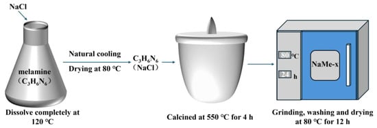 A total of 6 g of melamine was completely dissolved in 200 mL of deionized water at 120 °C. Subsequently, 10 mL of a 1 mol·L−1 NaCl solution, prepared using deionized water, was added to the solution. The mixture was maintained at 100 °C for one hour. After crystal precipitation, the solution was allowed to stand for 8–10 h, following which the precipitate was washed multiple times with deionized water and dried at 80 °C. This precursor was designated as NaCl/Me-1. To investigate the effect of NaCl concentration, the procedure was repeated using NaCl solutions of 0.5 mol·L−1 and 2 mol·L−1, resulting in precursors labeled as NaCl/Me-0.5 and NaCl/Me-2, respectively. Unmodified melamine was processed similarly and designated as Me.