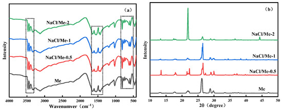 (a) FT-IR pattern and (b) XRD pattern of Me and NaCl/Me-x precursors.