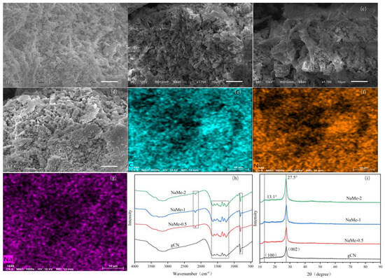 Characterization of NaMe-x samples. (a) Scanning electron micrographs of gCN; (b) scanning electron micrographs of NaMe-0.5; (c) scanning electron micrographs of NaMe-1; (d) scanning electron micrographs of NaMe-2; (e–i) EDS energy spectral scans of NaMe-1; (h) FT-IR spectra of gCN and NaMe-x; (i) XRD spectra of gCN and NaMe-x.