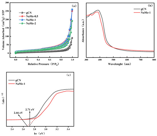 (a) Nitrogen adsorption–desorption isotherms for gCN and NaMe-x; (b) UV-Vis-DRS absorption spectra; (c) Kubelka–Munk curves for gCN and NaMe-1.