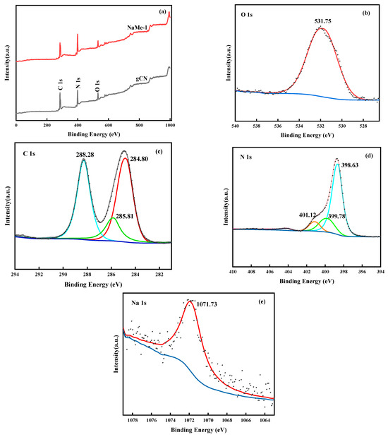 (a) XPS full spectra of gCN and NaMe-1; (b) NaMe-1 high-resolution XPS spectra of O 1s, (c) C 1s, (d) N 1s, and (e) Na 1s.
