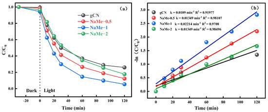 (a) Catalytic performance of gCN and NaMe-x; (b) first-order kinetic simulation of gCN and NaMe-x.