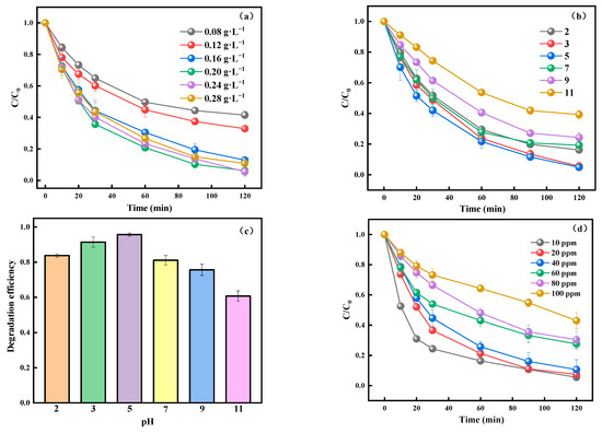 In dosage experiments with NaMe-1 (Figure 7a), increasing the catalyst concentration from 0.08 g·L−1 to 0.20 g·L−1 enhanced the degradation rate of TC-HCl from 0.00718 min−1 to 0.0239 min−1 (Table S2). This increase is attributed to the production of free radicals such as ·OH and ·O2−, which accelerate reactions and improve overall reaction rates. However, excessive catalyst amounts can hinder light penetration and lead to surplus free radicals, potentially causing self-quenching effects that reduce photocatalytic efficiency [68,69]. The initial pH of aquaculture tailwater also significantly impacted TC-HCl degradation efficiency. Under visible light, degradation efficiency initially increased with rising pH, peaking at pH 5, but declined between pH 7 and 11 (Figure 7b,c). Specifically, efficiency rose from 85% to 95% when shifting from pH 2 to 5. NaMe-1 exhibited optimal catalytic performance in acidic conditions, particularly between pH 3 and 5, under visible illumination. This behavior is attributed to improved separation rates of photogenerated carriers in acidic environments, promoting radical generation and enhancing degradation efficiency [70]. However, excessive H+ concentrations in highly acidic environments can lead to protonation, causing electrostatic repulsion between the catalyst and TC-HCl, and scavenging ·OH radicals, thereby diminishing degradation efficiency [71]. This is in line with the findings of Z Ciğeroğlu et al. [72], where the region with the best catalyst effect is around 3.5. These findings suggest that while acidic or neutral conditions are generally suitable for TC-HCl degradation in most water bodies, reaction conditions should be controlled to remain within neutral or slightly acidic ranges for optimal performance.