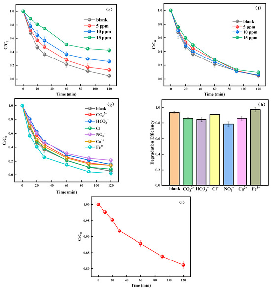(a) Effect of different dosages; (b,c) effect of pH; (d) effect of different initial concentrations; (e) effect of humic acid; (f) effect of sodium acetate; (g,h) effect of co-existing ions; (i) validation test for Fe3+.