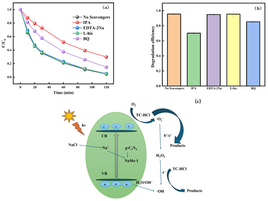 (a,b) Free radical trapping experiments; (c) photocatalytic mechanism of TC-HCl degradation by NaMe-1.