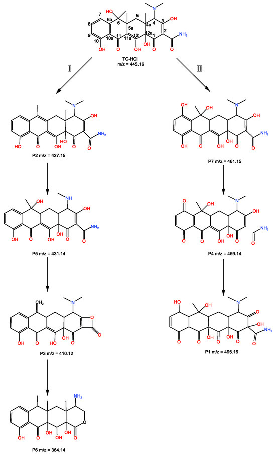 Possible degradation pathways of TC-HCl over NaMe-1 catalyst (pathway I on the left; pathway II on the right).
