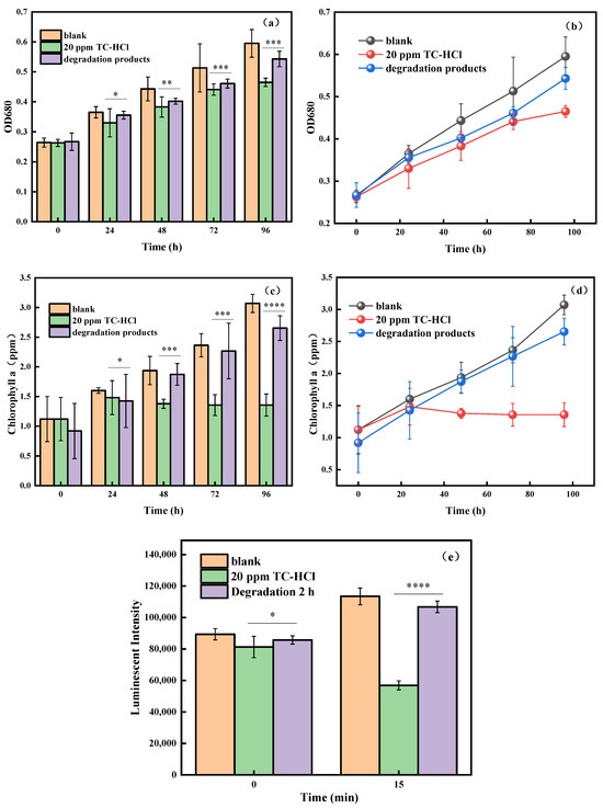 (a,b) Changes in OD680 of C. vulgaris; (c,d) changes in chlorophyll a concentration of C. vulgaris; (e) changes in toxicity of luminescent bacteria. * p < 0.05; ** p < 0.01; *** p < 0.001; **** p < 0.001.