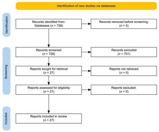 A PRISMA flow diagram outlining the literature-filtering process appears in Figure 1. The initial search yielded 728 papers (Supplementary Table S1). Subsequently, this work screened the titles and abstracts of all the retrieved documents for their relevance to the research theme. Only those papers that evidenced the relationship between plankton and the provision of ESs participated in the subsequent analyses. This selection resulted in 27 papers analyzed to obtain a detailed description of the main ESs provided by plankton. As detailed information about ESs of specific plankton taxa was mainly unavailable in the literature, this work assigned ESs to major plankton groups (Supplementary Tables S2 and S3). The ESs provided by each plankton group identified from the literature review, based on the CICES classification [], were visualized through an alluvial diagram using the alluvial package (https://github.com/mbojan/alluvial, accessed on 20 February 2024) in R version 4.3.2 [].