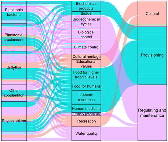 An alluvial diagram showing ESs (center, based on the CICES classification []) identified from the systematic review of the literature for plankton groups (left), with colors following the corresponding ES category (right) of each identified planktonic ESs.