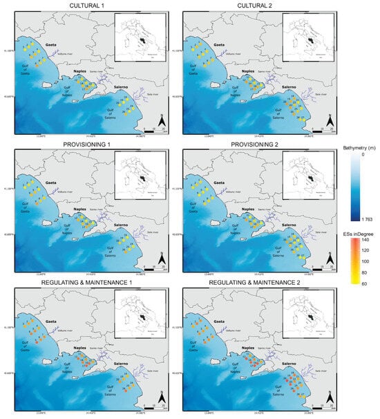 Median inDegree values of each ES category within each gulf and sampling survey (indicated with numbers next to the colored circles, see Supplementary Tables S4, S6 and S7). 1 = autumn; 2 = summer.
