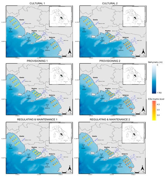 Marine ecosystems and their biodiversity provide multiple ecosystem services (ESs), including carbon storage, primary production, the provision of food and materials, and recreational opportunities [,]. Based on the Common International Classification of Ecosystem Services (CICES), ESs fall into three main categories: (i) regulating and maintenance, which includes ESs that ensure optimal environmental conditions for ecosystems (e.g., water quality and climate regulation); (ii) provisioning, which mainly includes ESs related to the direct provision of goods such as food and materials; and (iii) cultural, which includes non-tangible, immaterial benefits like recreational and educational activities [].
