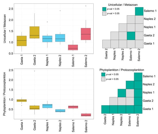 Boxplots for unicellular to metazoan and phytoplankton to protozooplankton ratios of each gulf and sampling survey, and heatmaps showing statistical significance of pairwise Wilcox test (p-value < 0.05 means samples are significantly different). 1 = autumn; 2 = summer.