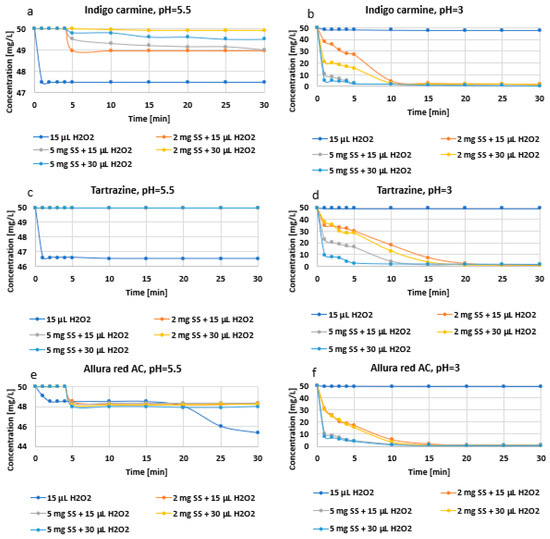 | Dye | Indigo Carmine | Tartrazine | Allura Red AC | Indigo Carmine | Tartrazine | Allura Red AC |