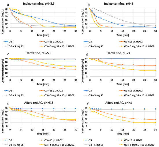 3.2. Degradation of Dyes in Ozonation and Hybrid Processes