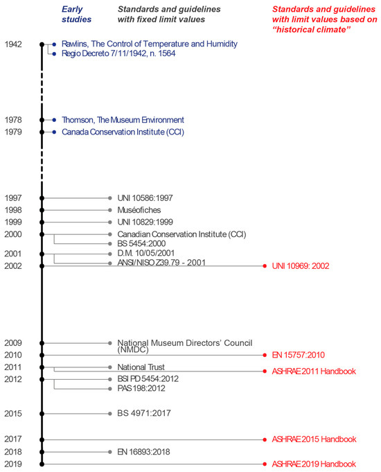 The next step consisted in synthesising the calculation procedures for the assessment of artwork preservation conditions for the collected guidelines and standards. They are often very different from each other, but the authors translated them into a common framework, which is represented by Table 1. and summarises the recommended T and RH for optimal preservation in terms of hourly, daily, and yearly (or seasonal) mean values, ranges, and variations. Moreover, the select documents reported in Table 1 are organised in a chronological sequence in Figure 1. The authors consider Table 1 a remarkable contribution of this literature review to the current state of the art. More information about Table 1 is given in Section 3.