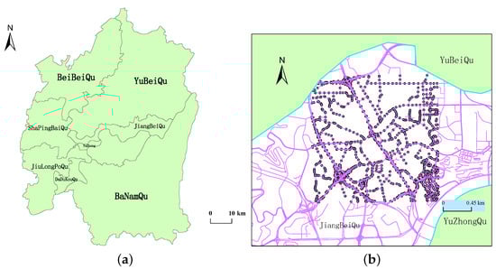 The spatial distribution of the study area and street sampling points. (a) The scope of the study area. (b) The spatial distribution of some street sampling points.