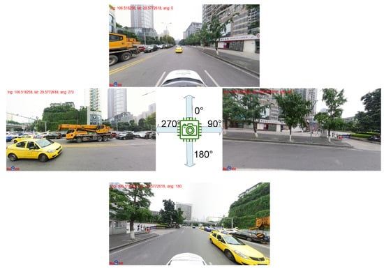 Road network data for Chongqing was sourced from OpenStreetMap. Road segments with street view imagery available on Baidu Maps were selected, while those without were excluded. To enhance the density of sampling points, the road network was densified at 100 m intervals, resulting in a set of street view sampling points. A random selection of 100 points was made, as shown in Figure 1. A Python script, combined with the panoramic static street view API, was employed to crawl street view images at each sampling point, covering a 360° panorama with 90° intervals. This process yielded a final dataset of 2879 street view images, obtained through spatial sampling and data partitioning.