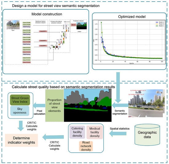 The combination of machine learning with street view data has significantly advanced street quality research by providing extensive high-resolution datasets [12,13,14]. Deep learning has enhanced the accuracy and efficiency of these analyses, offering strong tools for evaluating and optimizing street quality [15]. Researchers use deep learning models to assess street spatial quality through image segmentation, which automatically identifies key elements like pedestrians, vehicles, buildings, and greenery [16,17,18,19], providing a comprehensive view of street composition. Street view images also help track changes in urban street quality. Additionally, they provide insights into the built environment’s impact on street vitality, aiding in the creation of comprehensive, multi-dimensional street quality assessment models [20,21,22,23,24]. Scholars have refined these models by including metrics such as road motorization rate and visual entropy to better reflect specific urban contexts [25,26,27]. However, deep learning-based semantic segmentation models still face challenges in accurately recognizing and classifying complex street elements, especially in dense or variable lighting scenarios, where capturing fine details and contextual information is crucial for precise assessment [28].