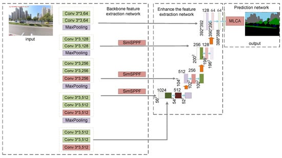 In the network architecture of SP-UNet, we adopt UNet [29] as the base model, with modifications to the backbone network using VGG16. Additionally, the SimSPPF module and the MLCA attention mechanism are integrated, as shown in Figure 4. This configuration enhances the model’s ability to perform the precise semantic segmentation of street view images. SP-UNet boasts a deeper and wider architecture compared to the standard U-Net, designed to capture more complex features and effectively handle the variability inherent in street view data. Skip connections are employed to link the encoder’s feature maps with the decoder at the same resolution level, facilitating the preservation of spatial information and enabling the decoder to refine segmentations with context from higher-resolution layers. Residual blocks are introduced within the network to simplify optimization and enable the training of deeper networks, incorporating identity mappings that facilitate gradient flow during backpropagation. The integration of attention mechanisms allows the model to focus on relevant features for street quality prediction, enhancing its ability to emphasize regions of interest while suppressing less significant features.