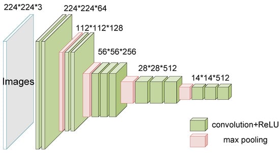 To enhance the feature extraction capability of the UNet backbone, this paper integrates the deeper VGG16 network to capture richer high-level semantic information. The down-sampling path now includes three convolutional layers, up from two, thereby improving the network’s nonlinear transformation capacity and further preserving image details and edge information. The architecture of the VGG16 network, depicted in Figure 5, comprises convolutional and max-pooling layers and is engineered to leverage pre-trained weights from ImageNet, which contributes to improved model initialization and enhanced training efficiency.