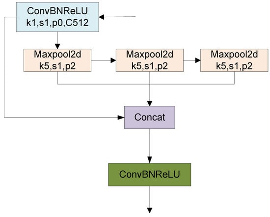To capture multi-scale contextual information, mitigate overfitting, and enhance generalization capabilities, this paper introduces the SimSPPF module, positioned at the feature layer junction of the UNet network’s encoding–decoding pathway, as depicted in Figure 6. The integration of the SimSPPF module reduces computational complexity, accelerates inference speed, and facilitates the fusion of local and global features, ultimately improving detection accuracy. These enhancements significantly improve the network’s performance in image segmentation and object detection tasks, making it more suitable for complex image processing scenarios.