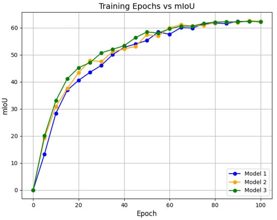 Comparison of mIoU. Note: Model 1: VGG16; Model 2: VGG16 + SimSPPF; Model 3: VGG16 + SimSPPF + MLCA.