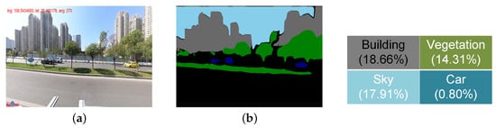 The semantic segmentation dataset comprises the open-source Cityscapes dataset and a selection of self-collected street view images, as depicted in Figure 2. The training and validation sets contain a total of 2637 meticulously annotated images, with 2373 images in the training set and 264 images in the validation set. Each image has a resolution of 1024 × 2048 pixels. To optimize GPU memory usage during model training, the image resolution was reduced to 512 × 512 pixels, and data augmentation techniques were employed. Ultimately, the validation set was utilized to assess the model’s accuracy.