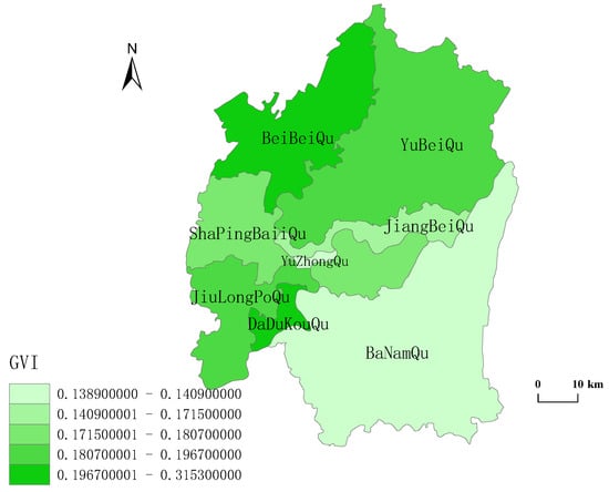 The Green View Index reflects the proportion of visible green spaces within a city, serving as an indicator of the urban greening level and ecological environment. As illustrated in Figure 10, Beibei District stands out with the highest Green View Index, signaling the area’s extensive green coverage and overall favorable green space environment. Both Dazhuokou and Yubei Districts also exhibit relatively high Green View Indices, although they fall short of Beibei’s levels. In contrast, Yuzhong and Banan Districts show lower Green View Indices, suggesting these areas may have limited green coverage and less favorable urban greening conditions.