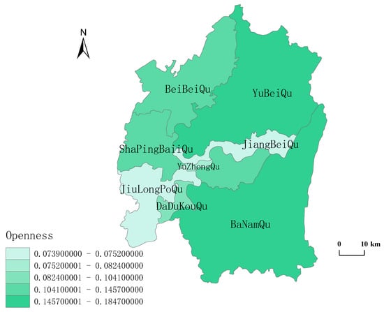 The Open Space Index measures the proportion of open space within a city, which is often closely linked to urban accessibility and livability. As shown in Figure 11, Yubei District has the highest Open Space Index, indicating a greater availability of open spaces, making the area more suitable for residential living and recreational activities. Nanan District and Shapingba District also feature spacious public and leisure areas. In contrast, Jiangbei District has a lower Open Space Index, suggesting potential challenges related to spatial density and insufficient open areas.