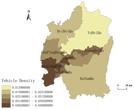 Vehicle density indicates the number of vehicles per unit area, which is typically associated with traffic flow and congestion. As shown in Figure 12, Jiulongpo District has a high vehicle density, suggesting that the area may face significant traffic congestion. Yuzhong District and Jiangbei District also exhibit relatively high vehicle densities, which could point to potential traffic issues. In contrast, Yubei District and Beibei District have lower vehicle densities, indicating less traffic congestion and potentially smoother traffic flow.