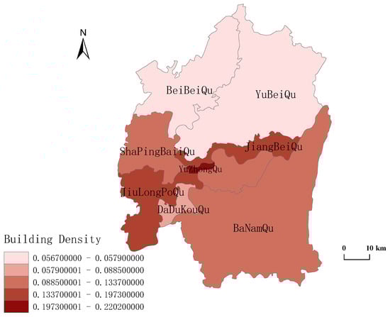 Building density refers to the number of buildings per unit area, reflecting the level of spatial utilization and development density in a city. As shown in Figure 13, Yuzhong District and Jiulongpo District have the highest building densities, indicating higher levels of urbanization, more closely packed buildings, and possibly greater population densities. Jiangbei District also has a relatively high building density, suggesting more compact urban development. In contrast, Beibei District and Yubei District have lower building densities, indicating less urban development and a more spacious, relaxed residential environment.